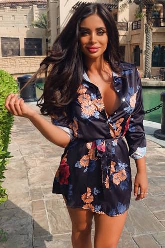 • Rochie mini din satin, tip camasa. Imprimeu floral pe fundal negru. Modelul are 175cm si poarta marimea S. Lungime aproximativa: 87 cm Compozitie: 100% poliester
