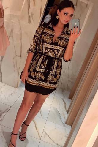 • Rochie tip camasa, cu nasturi si cordon in talie. Imprimeu stil baroc in nuante de negru, alb si auriu. Fabricata din poliester.