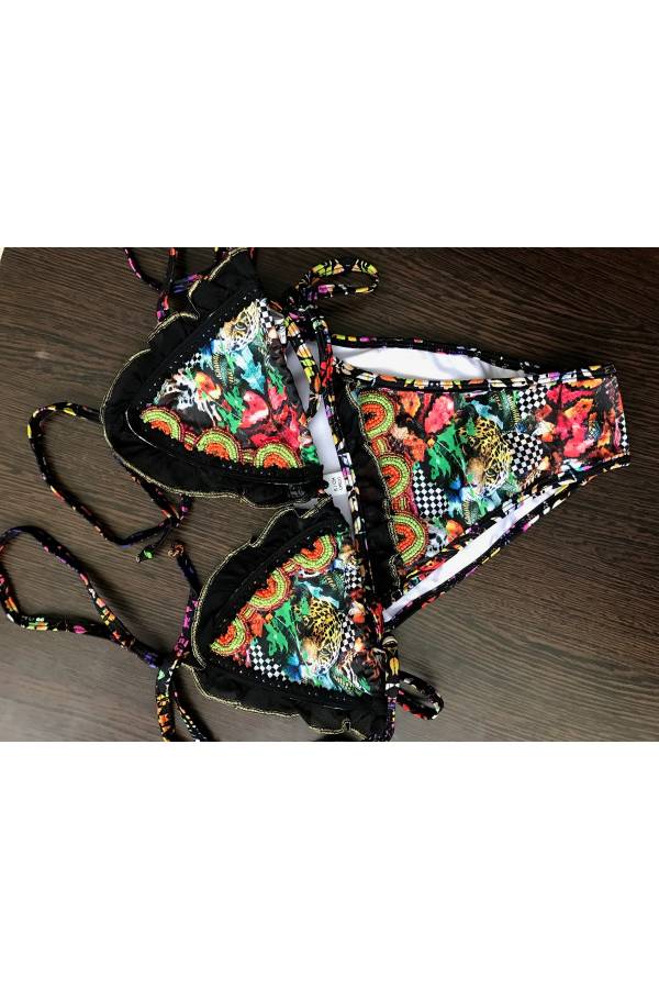 Costum de baie din doua piese cu chilot brazilian cu talie joasa. Sutien tip triunghi, fara bureti sau intarituri cu reglare si inchidere la spate cu snur. Chilotul cu inchidere cu snururi laterale foarte modern si sexy. Print jucaus cu volanase mici pe margini.