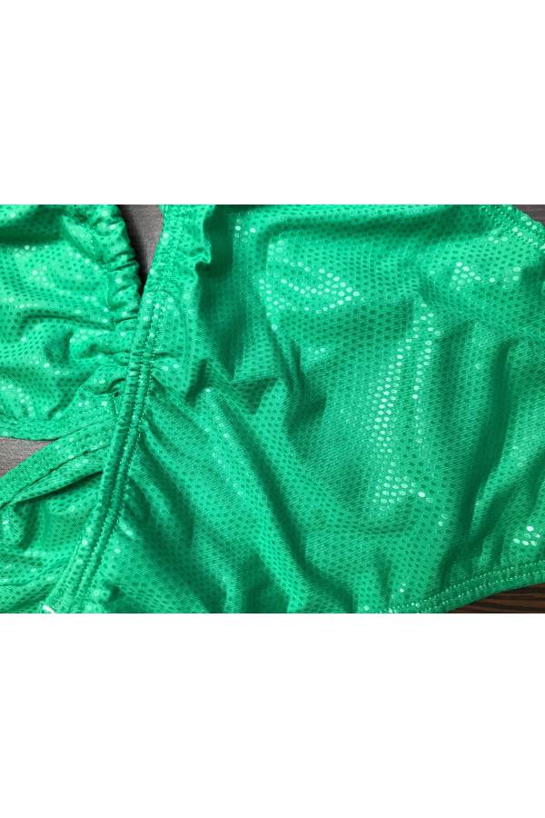 Costum de baie Premium, din doua piese, fabricat in Columbia. Materiale cu elasticitate mare,de inalta calitate, care asigura o uscare rapida. Verde intens cu aspect metalizat si detalii metalice aurii.