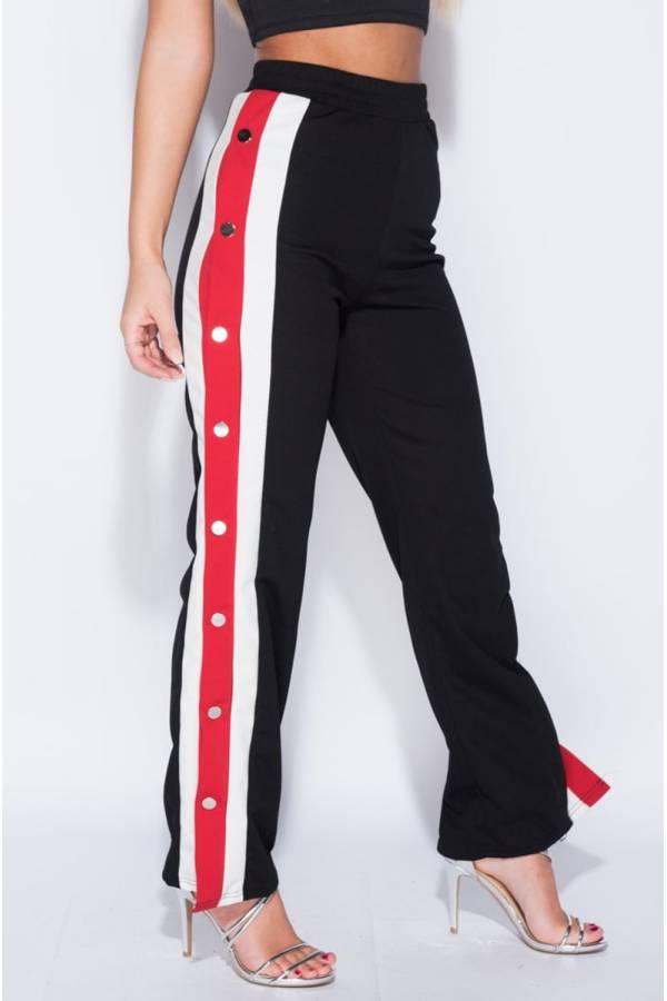 Pantalon cu aspect sport, cu deschidere laterala pe butoni si banda laterala alb/rosu.