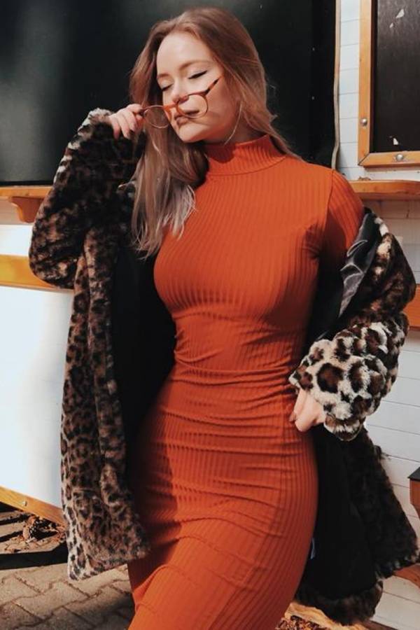 Rochie midi,culoare- ruginiu, mulata, cu maneca lunga.