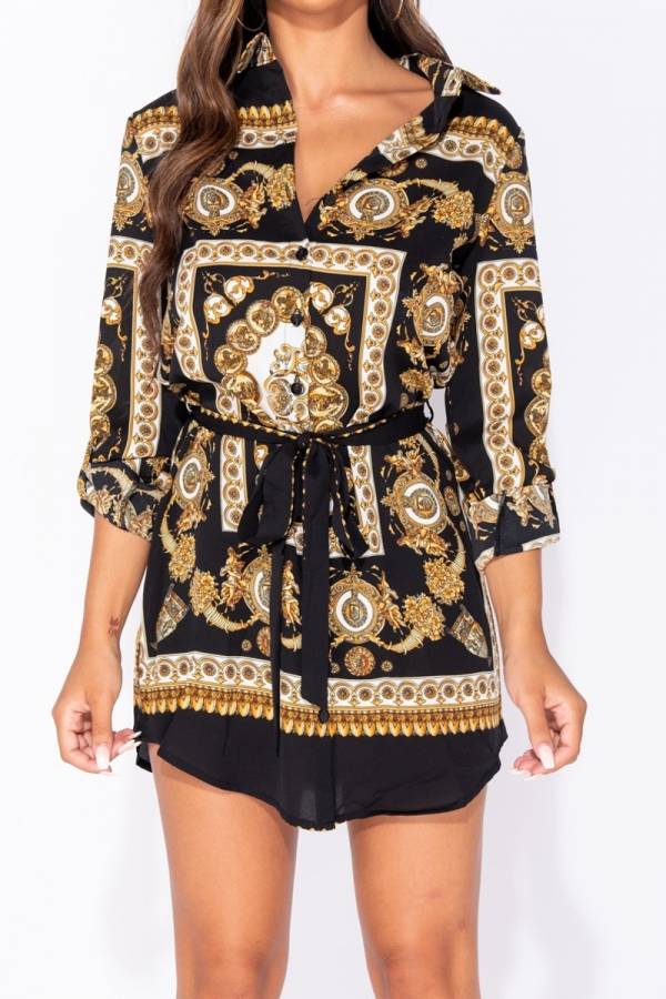 Rochie tip camasa, mini. Imprimeu animal print si baroc in nuante de maro, galben, alb si negru.