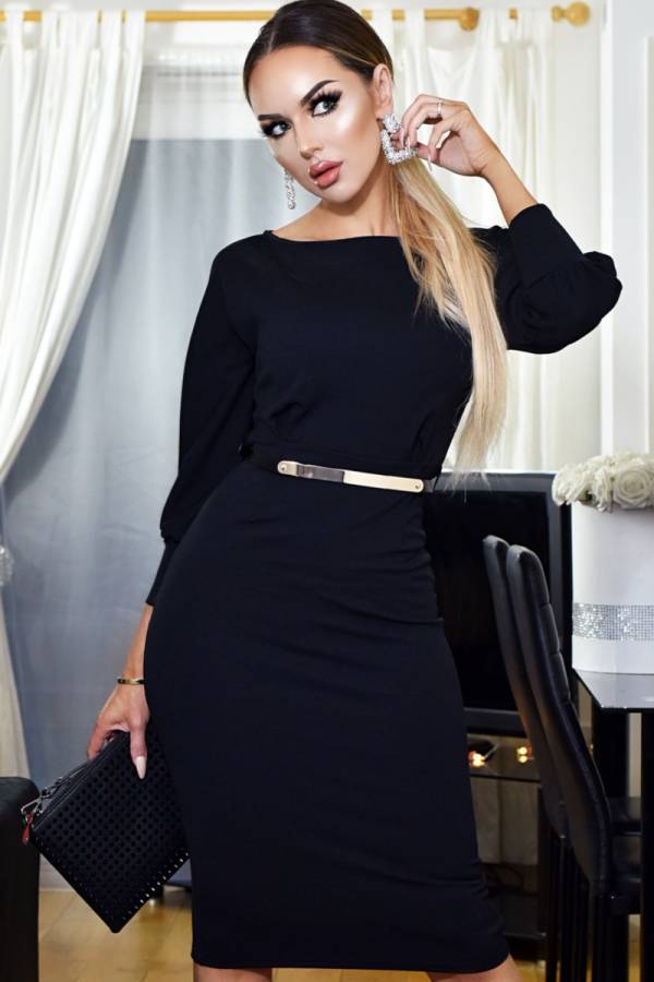 Culoare Negru. Model pe corp cu o curea neagra cu detalii aurii in talie pentru conturarea unei talii frumoase.