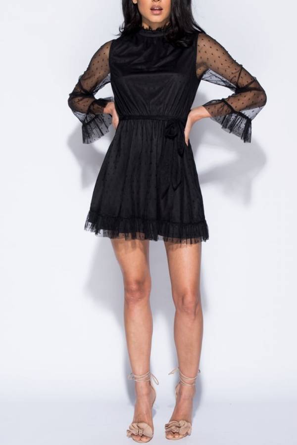 Rochie mini, neagra in clos cu maneca lunga din voal. Buline brodate pe voal.