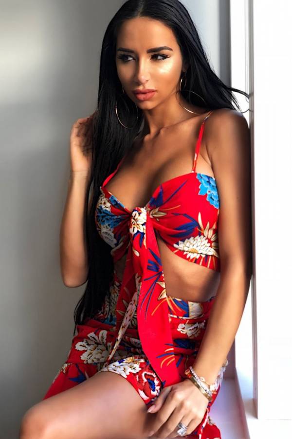 Set din doua piese: fusta si top. Imprimeu floral pe fundal rosu.