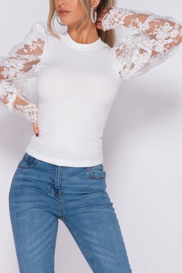 Bluza cu maneci lungi, bufante, din voal cu aplicatii florale din dantela.