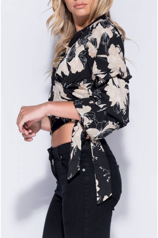Bluza scurta, petrecuta, cu snur. Imprimeu floral.