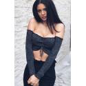 Bluza crop, sexy cu maneci lungi. Snur frontal pentru strangere si reglarea lungimii. Culoare negru cu insertii stralucitoare.