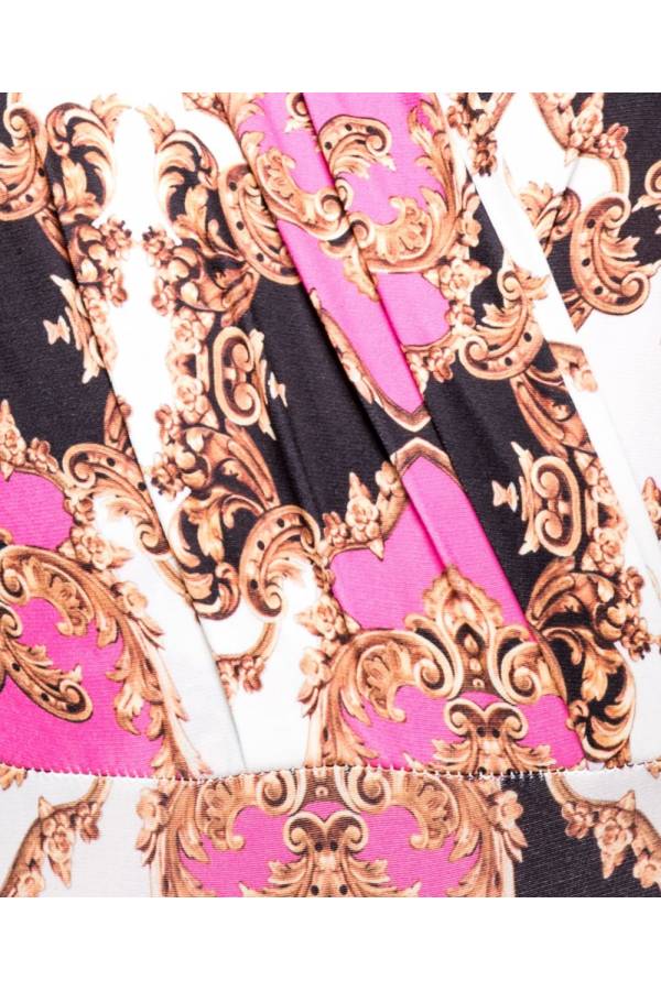 Body cu imprimeu luxos in stil baroc obtinut dintr-o combinatie in nuante de roz, auriu, negru si alb. Maneci lungi si decolteu amplu in V.